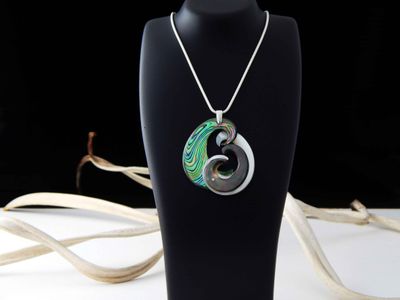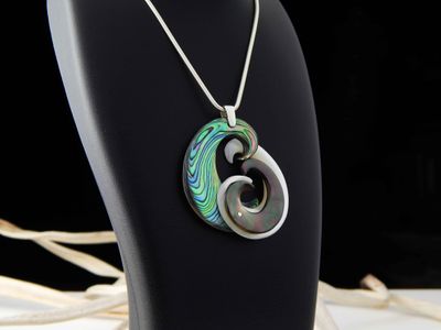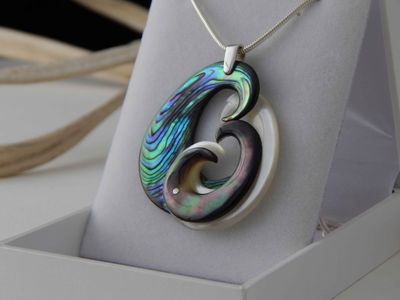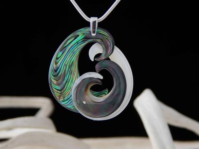 Three tone carved Mother of Pearl and Paua shell pendant hand made in Auckland by Neil Hanna. Featuring West Australian white Mother of Pearl, Tahitian black Mother of Pearl and New Zealand Paua Shell. Overall length 49mm. Sterling silver. Sterling silver chain 45cm (17.5 inches). Signed NH by the artist.