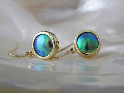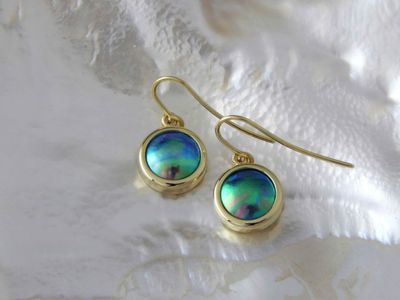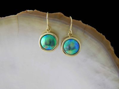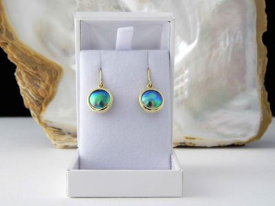 New Zealand Blue Pearl earrings designed and made in Auckland exclusively for Gallery Pacific. Featuring 11mm diameter pearls. 14ct gold mounts. Earrings overall length 24mm.