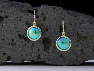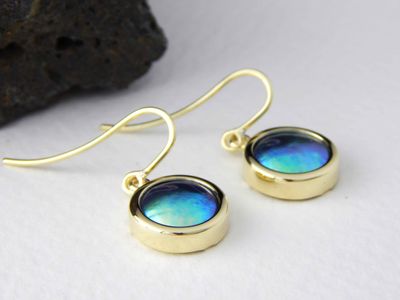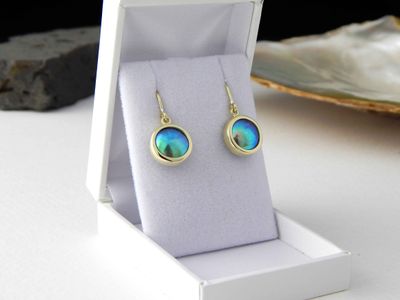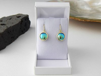 New Zealand Blue Pearl earrings designed and made in Auckland exclusively for Gallery Pacific. Featuring 11mm diameter pearls. 14ct gold mounts. Earrings overall length 24mm.