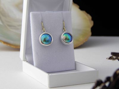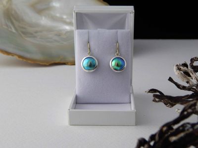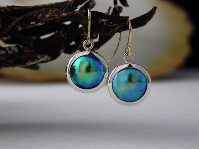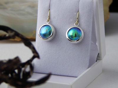New Zealand Blue Pearl earrings designed and made in Auckland exclusively for Gallery Pacific. Featuring 11mm diameter pearls. Two tone 14ct. yellow gold / sterling silver mounts. Earrings overall length 24mm.
