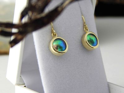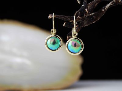 New Zealand Blue Pearl earrings designed and made in Auckland exclusively for Gallery Pacific. Featuring 9mm diameter pearls. 14ct gold mounts. Earrings overall length 23mm.