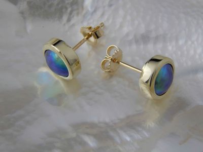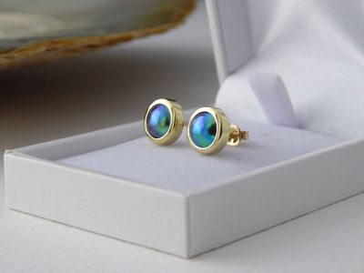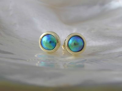 New Zealand Blue Pearl earrings designed and made in Auckland for Gallery Pacific. Featuring 8mm diameter pearls. 14ct. gold mounts.