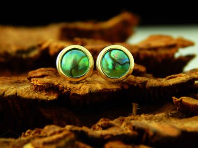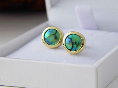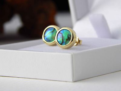 New Zealand Blue Pearl earrings designed and made in Auckland for Gallery Pacific. Featuring 8mm diameter pearls. 14ct. gold mounts.