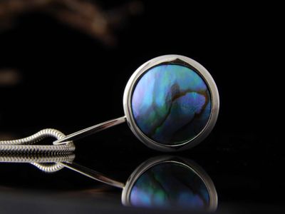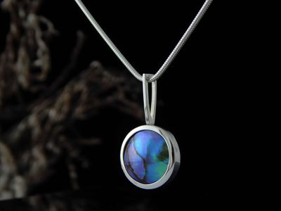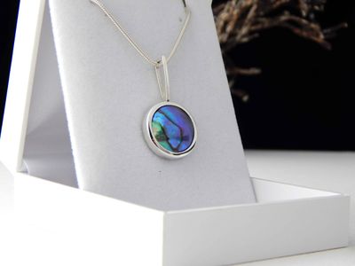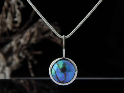 New Zealand Blue Pearl pendant designed and made in Auckland exclusively for Gallery Pacific. Featuring 18mm diameter pearl. Sterling silver mount. Pendant overall length 34mm. Sterling silver chain 45cm (17.5 inches).