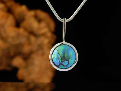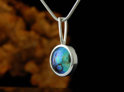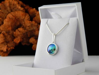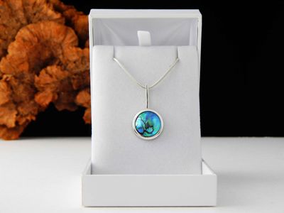 New Zealand Blue Pearl pendant designed and made in Auckland exclusively for Gallery Pacific. Featuring 17mm diameter pearl. Sterling silver mount. Pendant overall length 33mm. Sterling silver chain 45cm (17.5 inches).