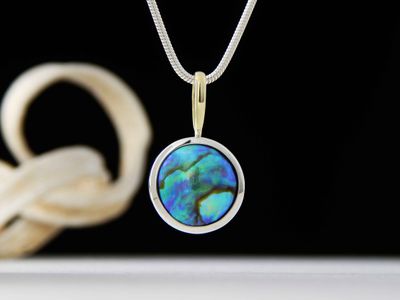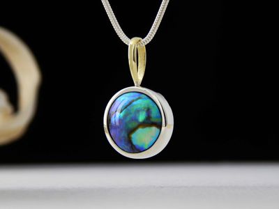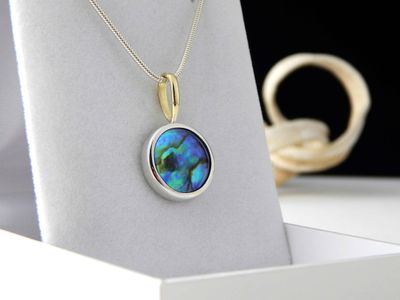 New Zealand Blue Pearl pendant designed and made in Auckland exclusively for Gallery Pacific. Featuring 17mm diameter pearl. Two tone 14ct. yellow gold / sterling silver mount. Pendant overall length 30mm. Sterling silver chain 45cm (17.5 inches).