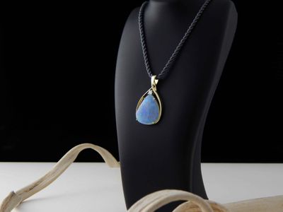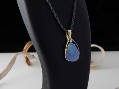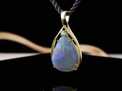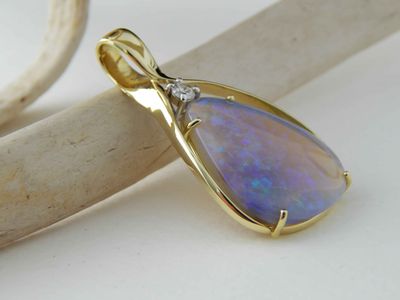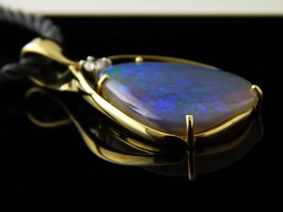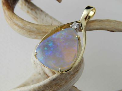 Opal pendant designed and hand made in Auckland exclusively for Gallery Pacific. Featuring free form Lightning Ridge Crystal Opal gemstone 14.9 carats, 26 x 21mm. Diamond total weight .16 carat. 14ct. gold mount. Pendant overall length 43mm. Photographed on braided satin cord.