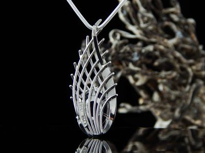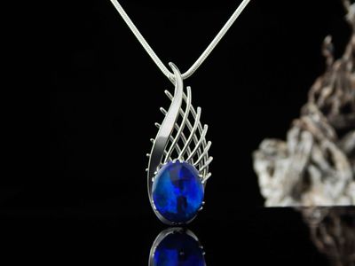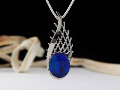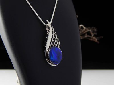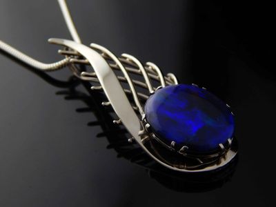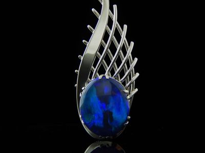 Black Opal pendant designed and made in Auckland exclusively for Gallery Pacific. Featuring Lightning Ridge Black Opal cabochon 8.88 carats, 20 x 16mm. 18ct. white gold mount. Pendant overall length 51mm. Photographed on Sterling Silver 'snake' type chain 50cm (19.5 inches).