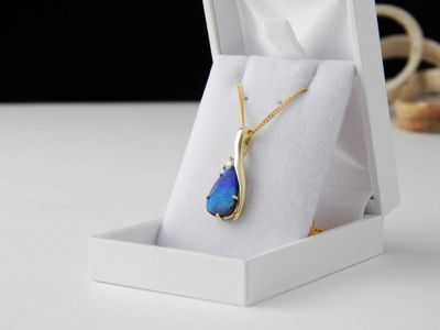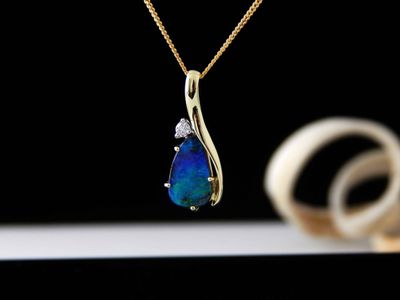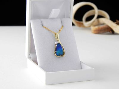 Boulder Opal pendant designed and hand made in Auckland for Gallery Pacific. Featuring free form Queensland Boulder Opal gemstone 2.70 carats, 13 x 8mm. 14ct. gold mount. Diamond .06 carat. Pendant overall length 25mm. Gold plated sterling silver chain 45cm ( 17.5 inches ).