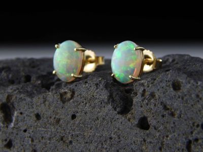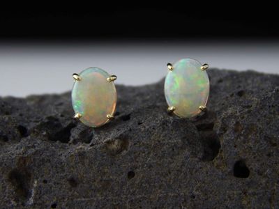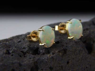 White Opal earrings made in Auckland for Gallery Pacific. Featuring pair of South Australian White Opal cabochons 8 x 6mm, total weight 1.4 carat. 14ct. gold mounts.