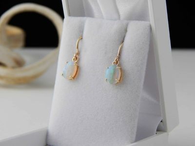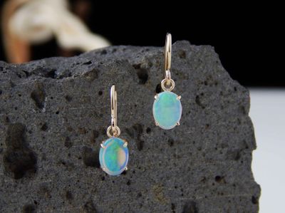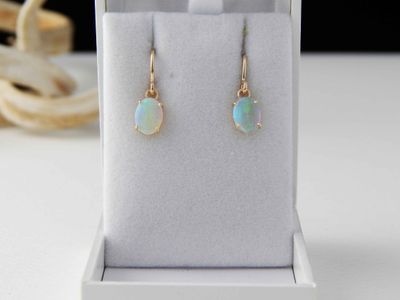 White Opal earrings made in Auckland for Gallery Pacific. Featuring pair of South Australian White Opal cabochons 8 x 6mm, total weight 1.4 carat. 9ct. gold mounts.