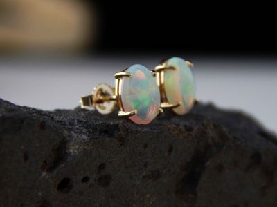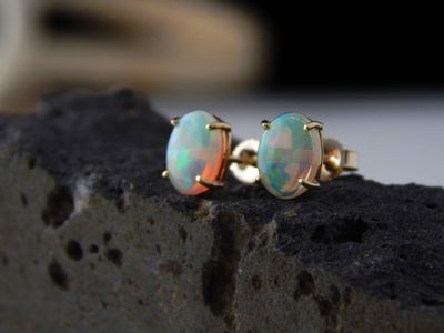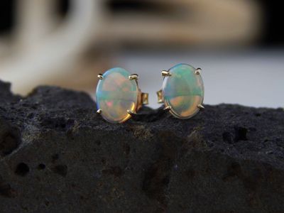 White Opal earrings made in Auckland for Gallery Pacific. Featuring pair of South Australian White Opal cabochons 8 x 6mm, total weight 1.4 carat. 9ct. gold mounts.